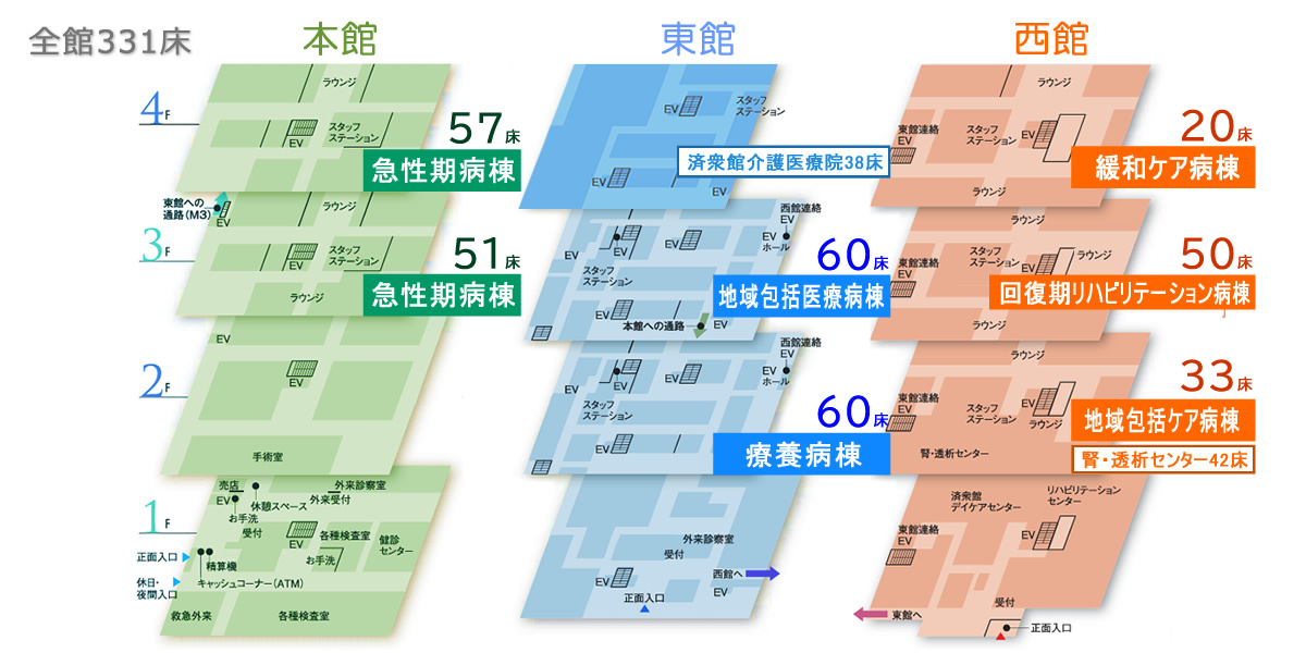 済衆館病院では、救急外来、リハビリテーションセンター、腎・透析センター、認知症疾患医療センター、高血圧・心不全センター、緩和ケア病棟、介護医療院、健診・ドックセンターなどを設置し、充実した診療体制で地域医療と介護をお支えしています。